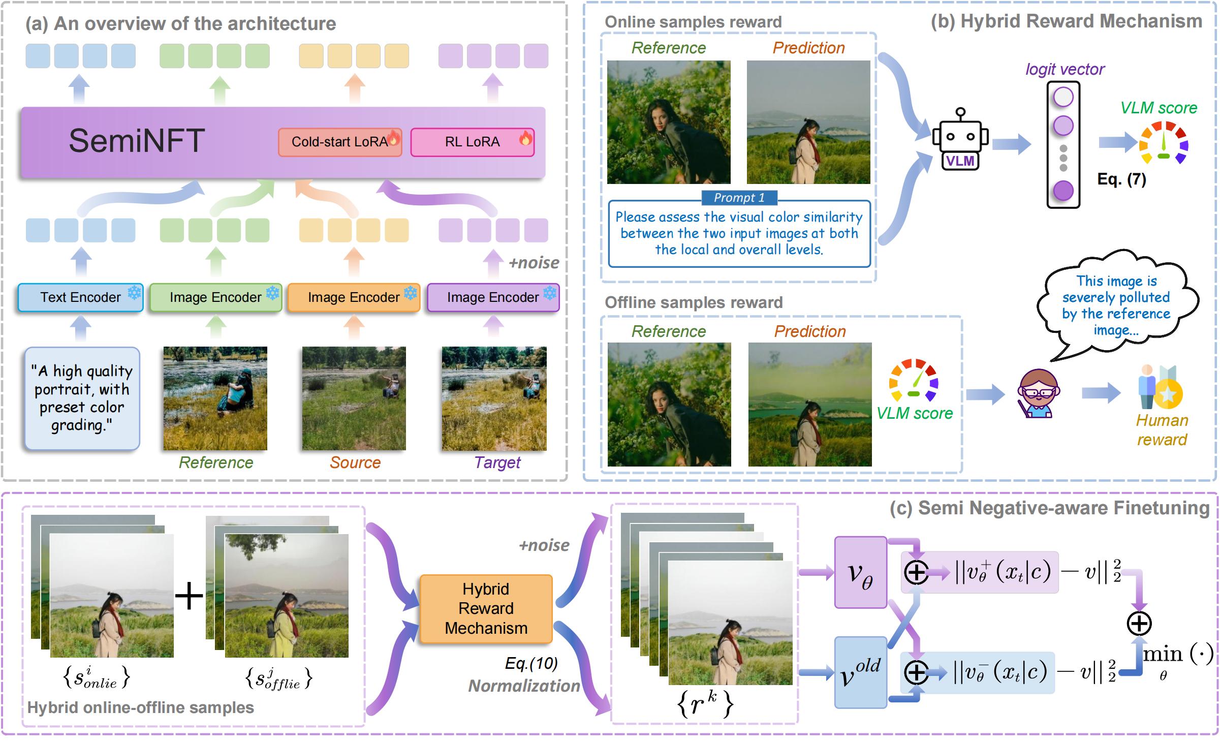 title={SemiNFT: Learning to Transfer Presets from Imitation to Appreciation via Hybrid-Sample Reinforcement Learning},