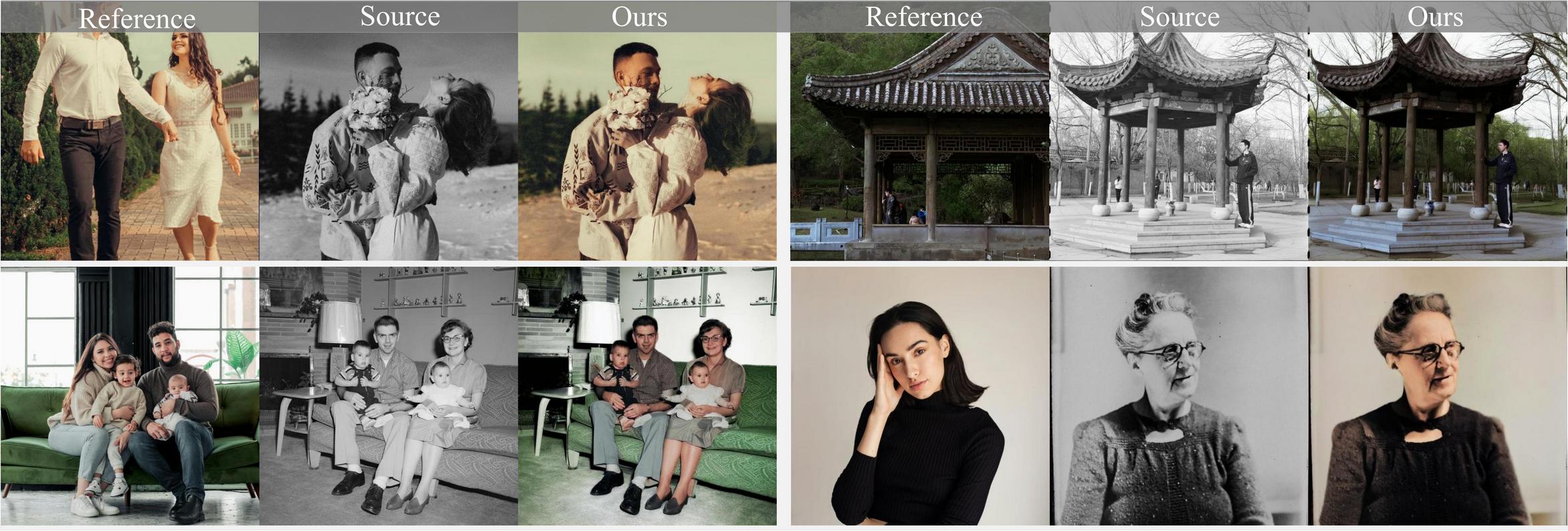 SemiNFT achieves impressive colorization results. Although a significant chromatic discrepancy exists between the black-and-white source image and color reference image, our model facilitates precise color mapping by aligning semantic regions, ensuring skin-to-skin and background-to-background consistency, demonstrating spatially coherent and semantically aware color transfer.