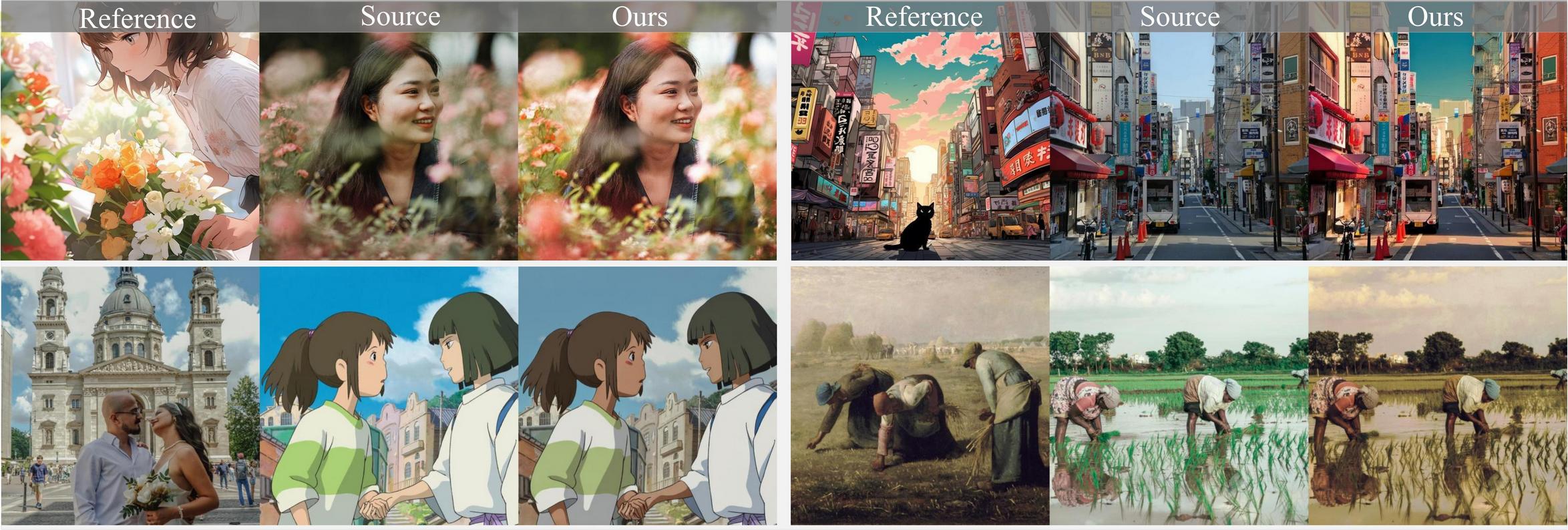 SemiNFT also enables cross-domain preset transfer, such as translating aesthetics between anime images and realistic photographs. SemiNFT strictly preserves the source content while changing only the color and tonal characteristics.