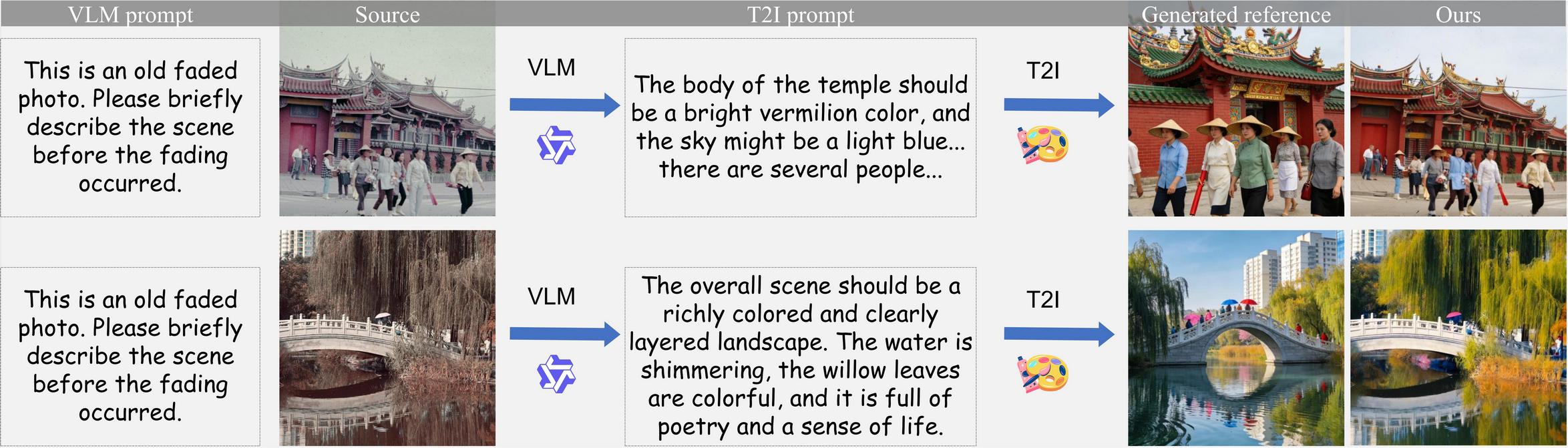 SemiNFT can be seamlessly integrated with existing VLMs and Text-to-Image (T2I) generative models to restore vintage photos. Specifically, by utilizing VLM to infer the possible color of the source image, a T2I model can synthesize a high-fidelity reference image for restoration.