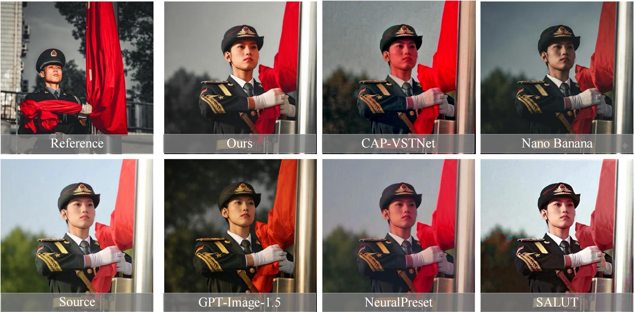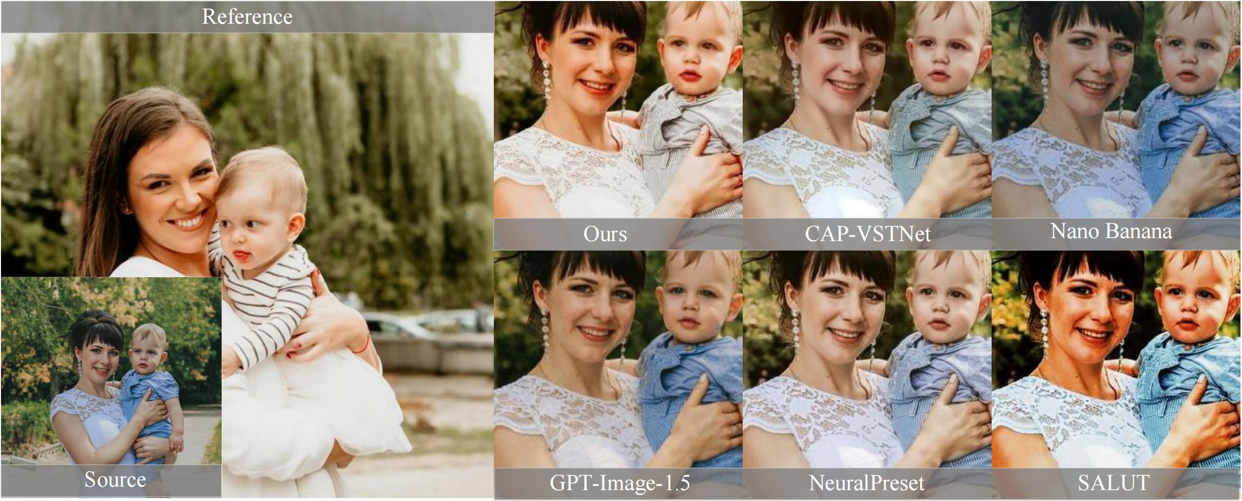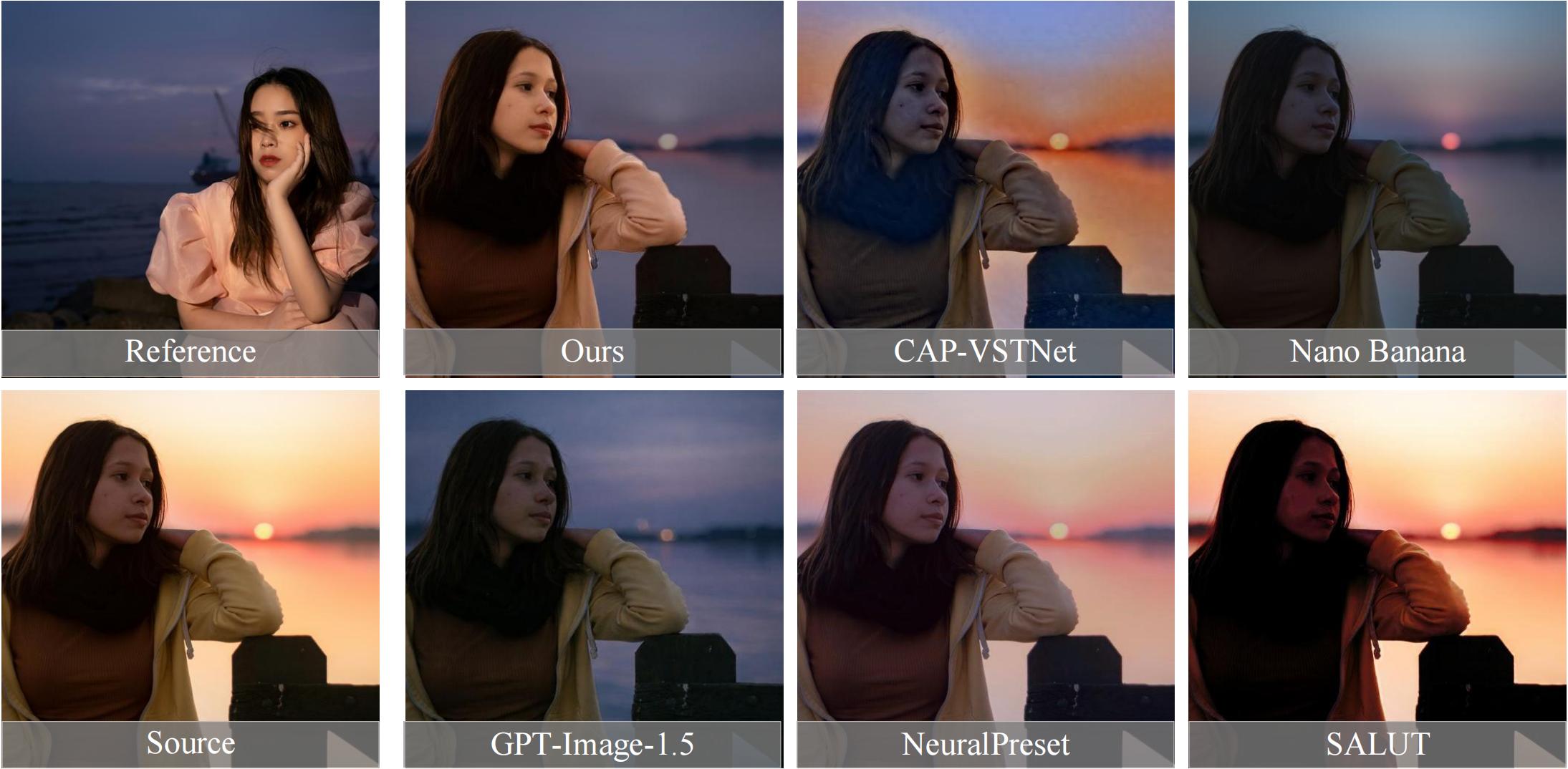 We provide the visualization results of SemiNFT and SA-LUT, Neural Preset, CAP-VSTNet, GPT-Image-1.5, and Nano Banana. Notably, our method does not use points for guidance in the generated results. Notably, our method achieves accurate color alignment at both global and local levels.