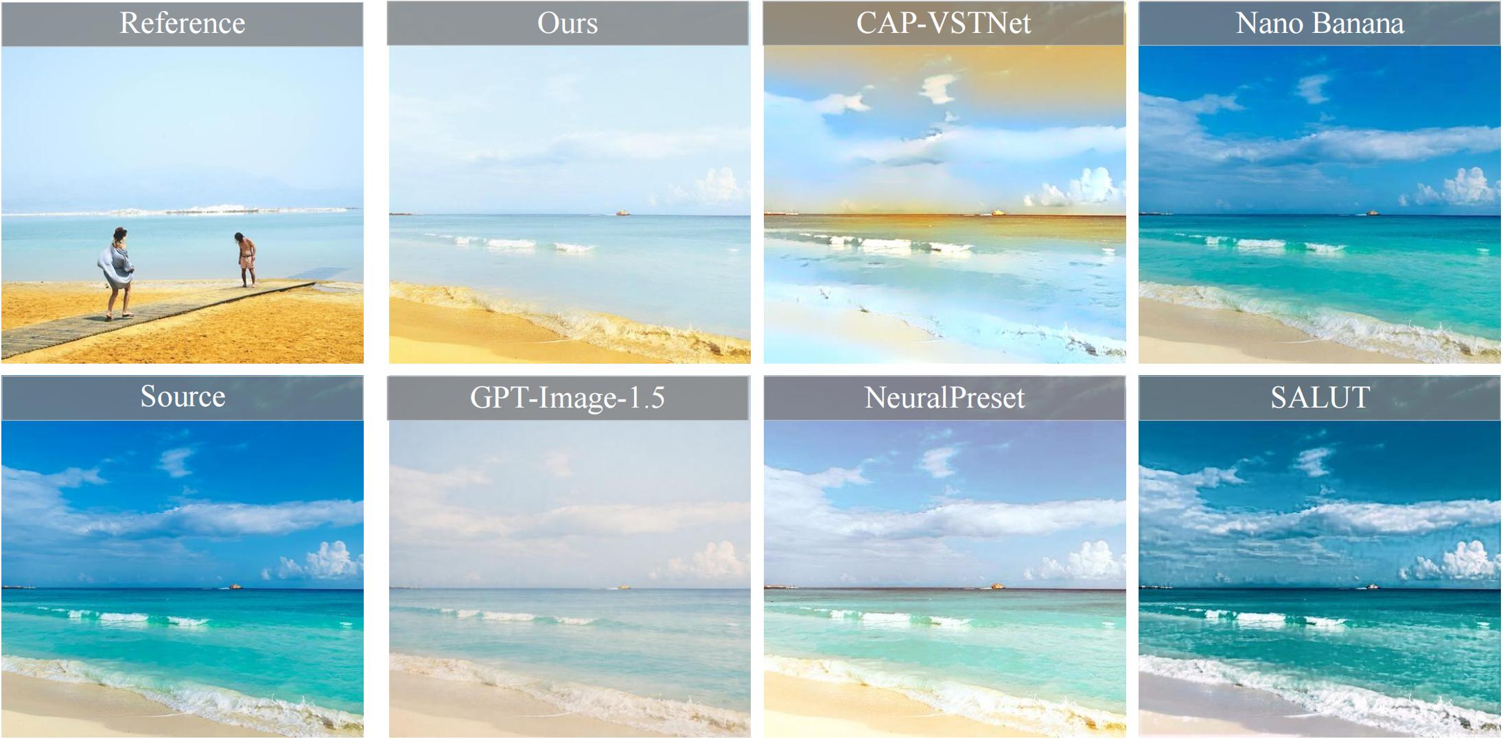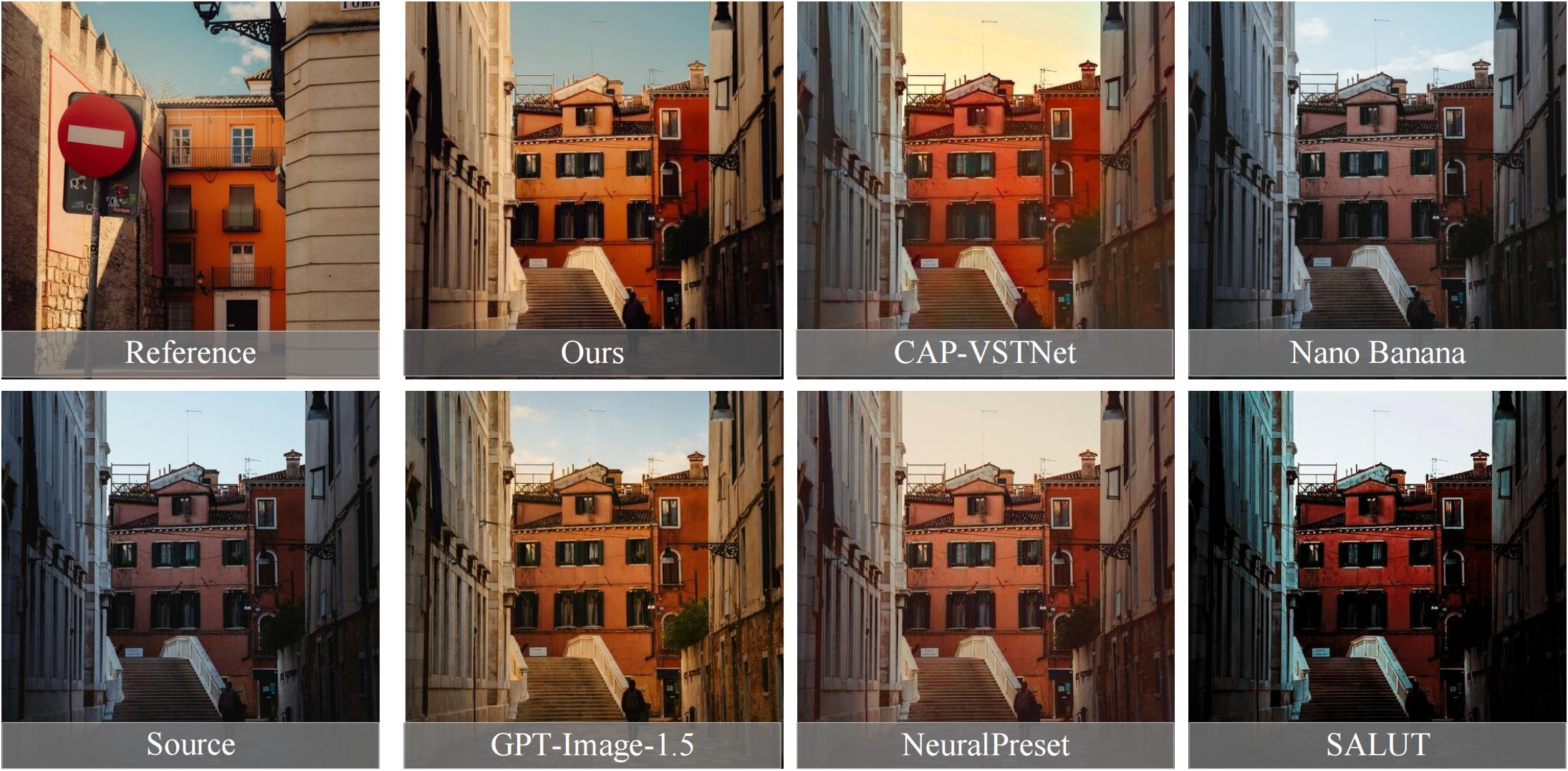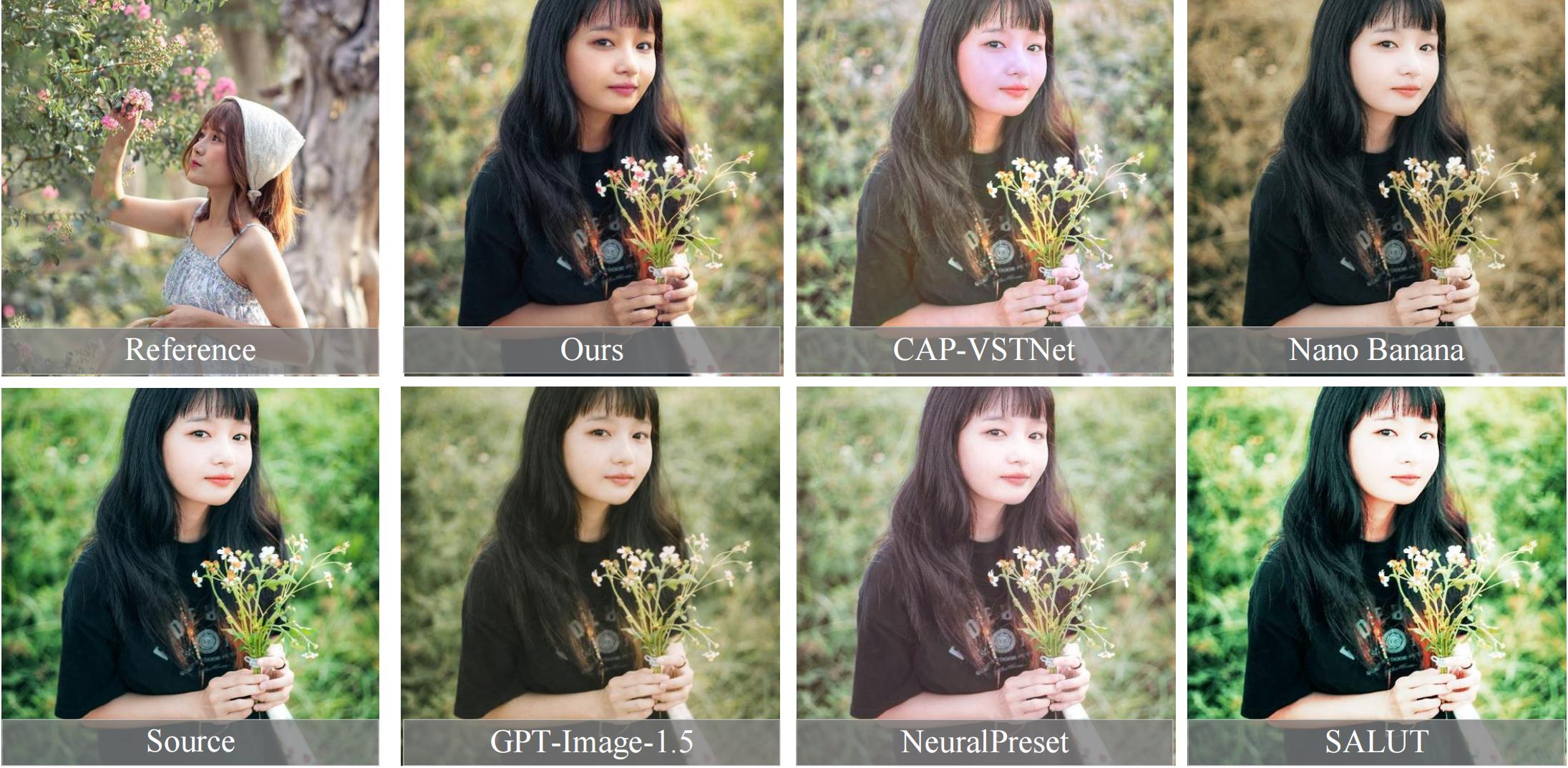 We provide the visualization results of SemiNFT and SA-LUT, Neural Preset, CAP-VSTNet, GPT-Image-1.5, and Nano Banana. Notably, our method does not use points for guidance in the generated results. Notably, our method achieves accurate color alignment at both global and local levels.